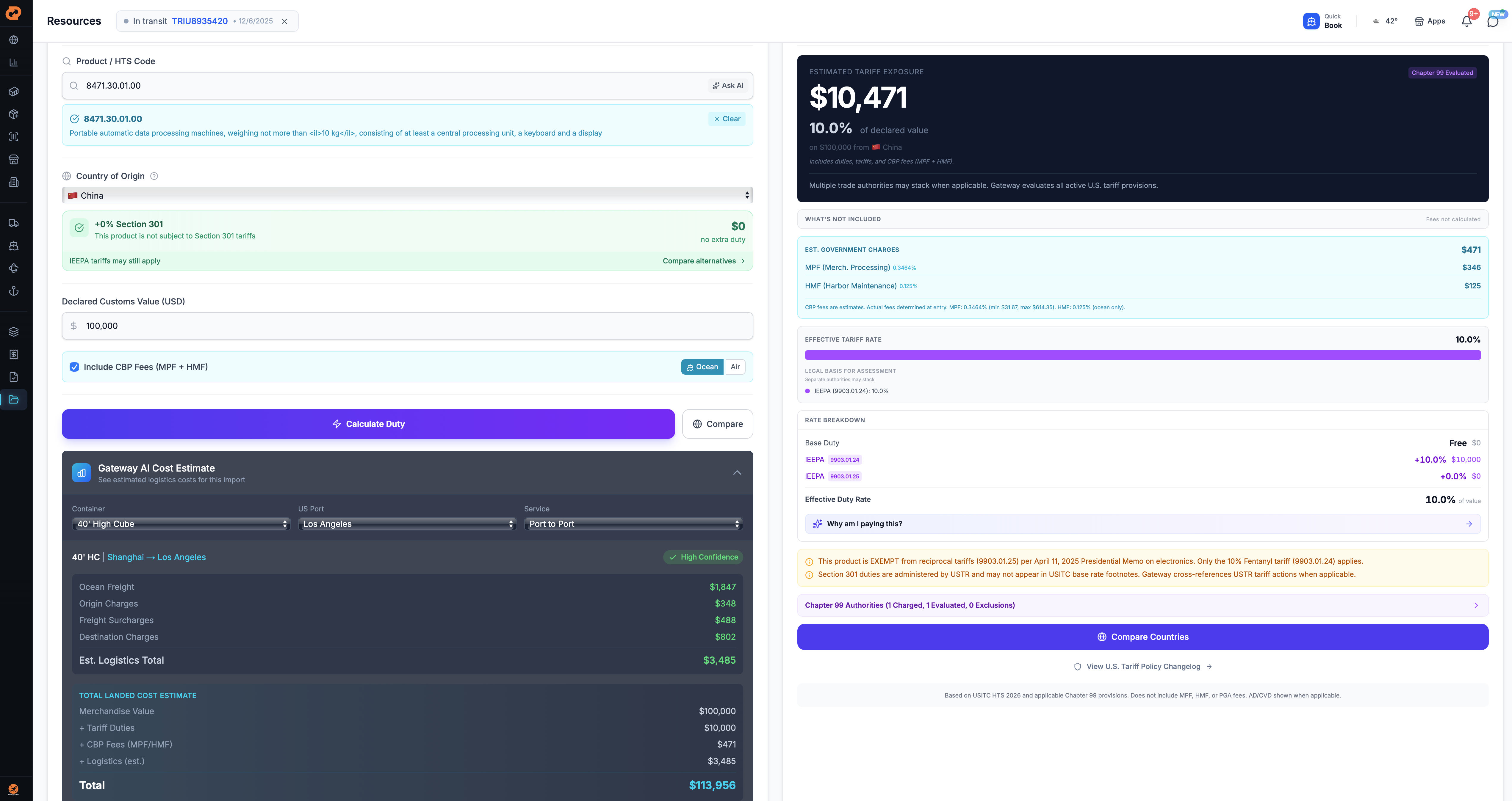 Unlike our public tariff calculator that stops at headline duty rates, Gateway’s platform delivers true landed cost intelligence, combining tariffs, customs fees, and logistics costs into a single, actionable view.