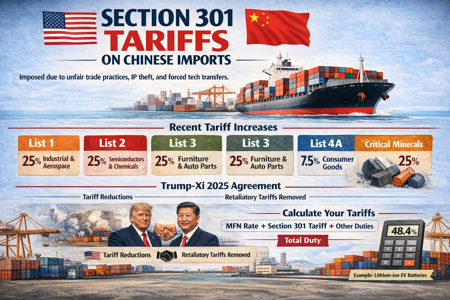 Section 301 tariffs are additional duties imposed on Chinese imports under Section 301 of the Trade Act of 1974. The U.S. Trade Representative (USTR) first implemented these tariffs in 2018 after an investigation found that China engaged in unfair trade practices, including forced technology transfers from U.S. companies, intellectual property theft, discriminatory licensing restrictions, and state-sponsored acquisition of U.S. technology.