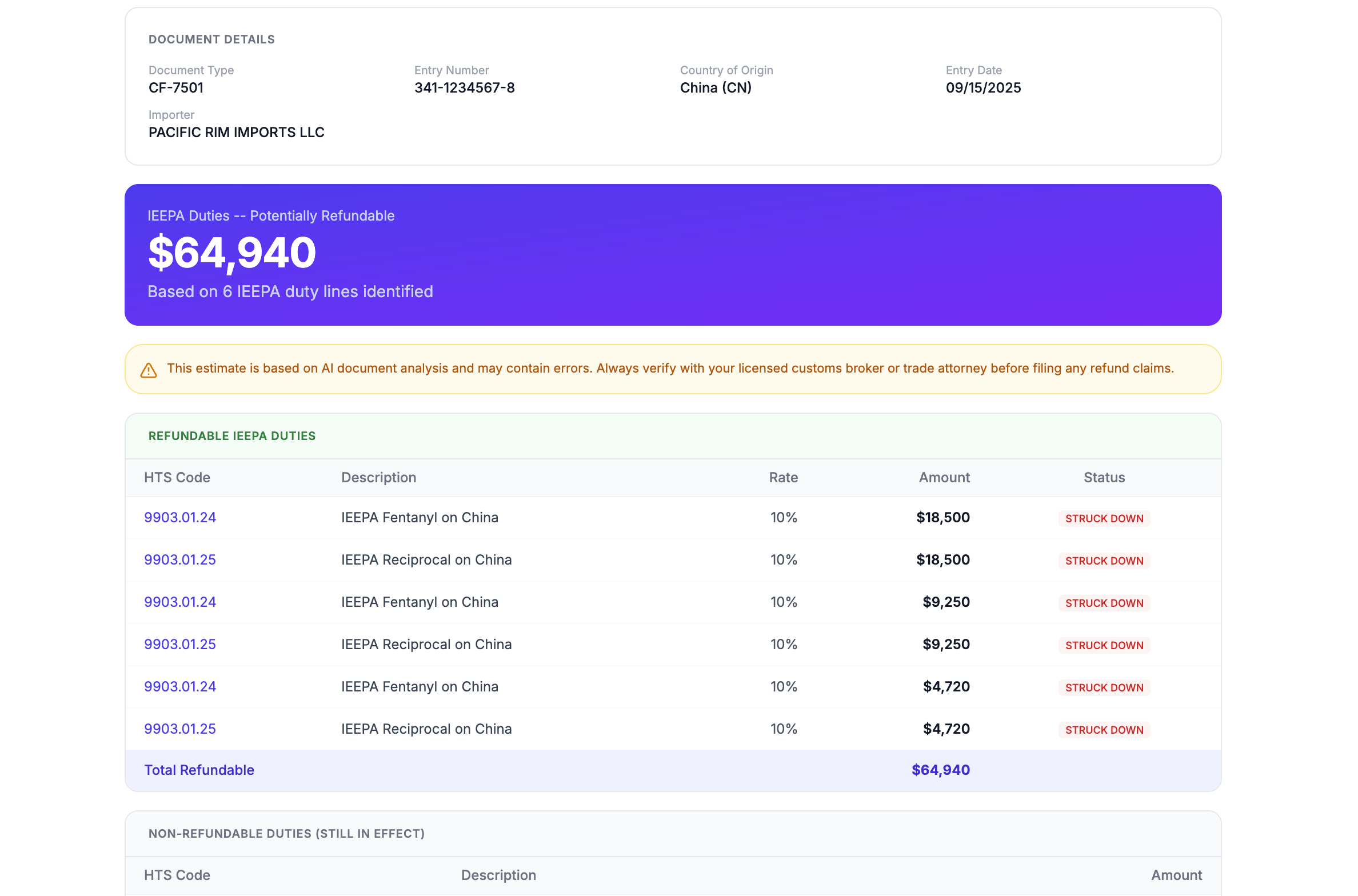 The system then separates duties into two categories: refundable (IEEPA tariffs that were struck down) and non-refundable (Section 301, Section 232, AD/CVD, and fees that remain valid). Users receive a full breakdown with the total estimated refund amount.